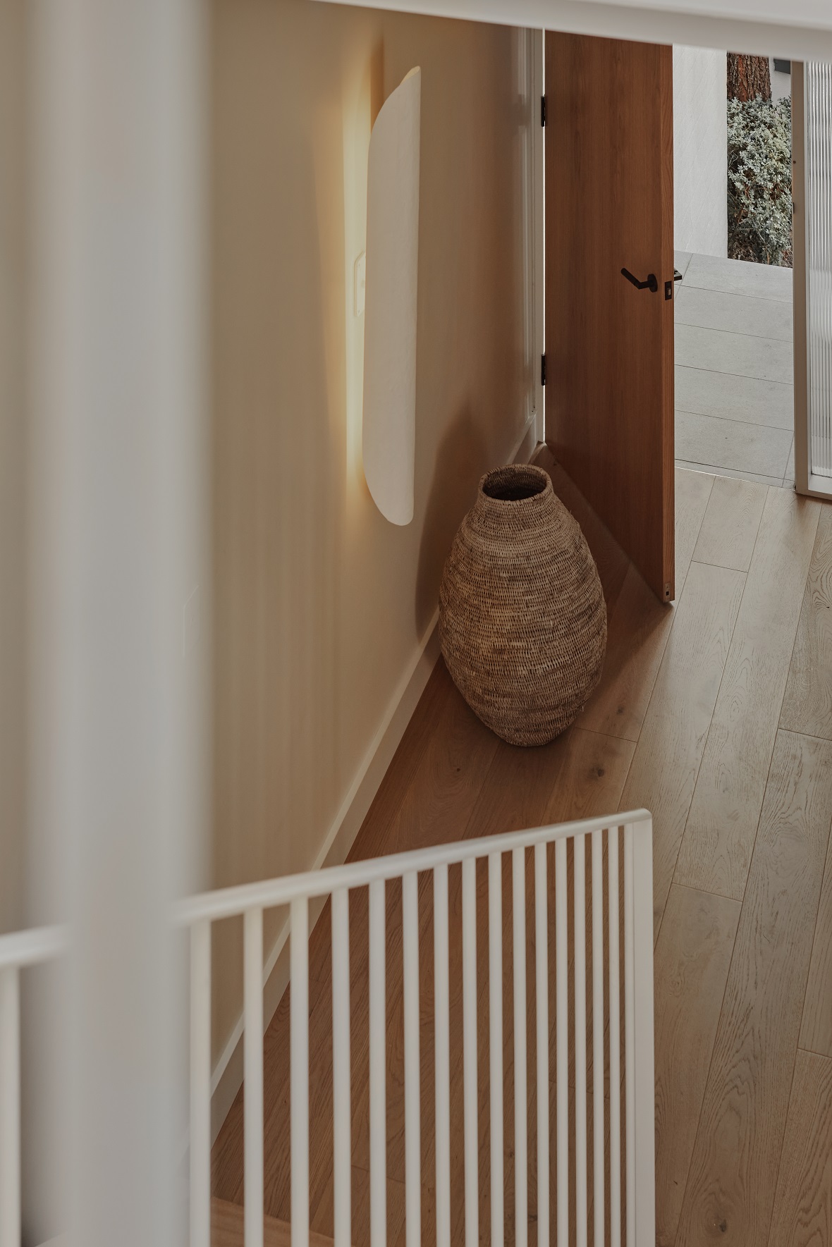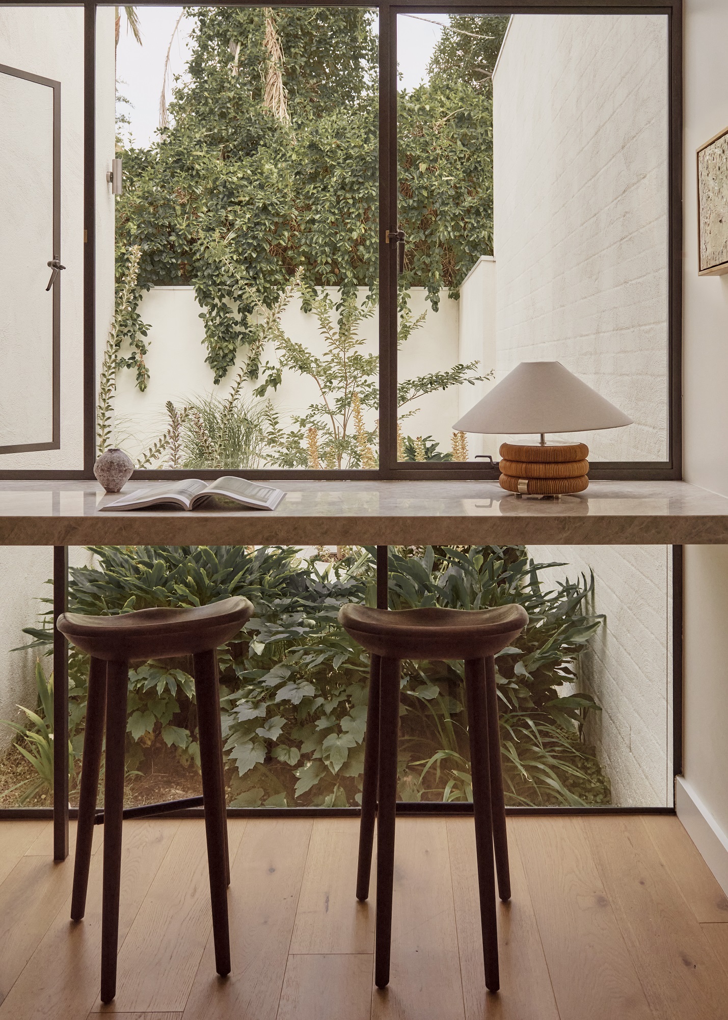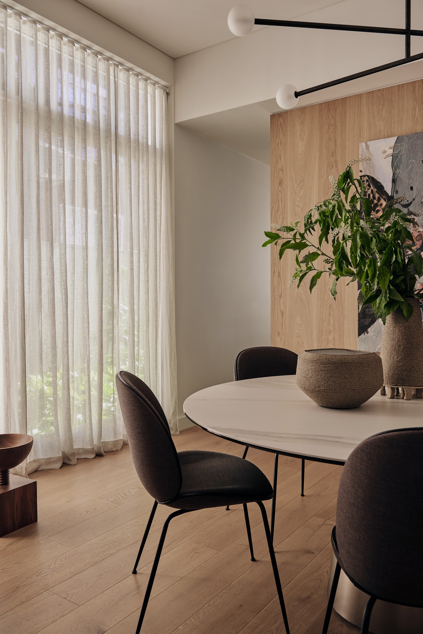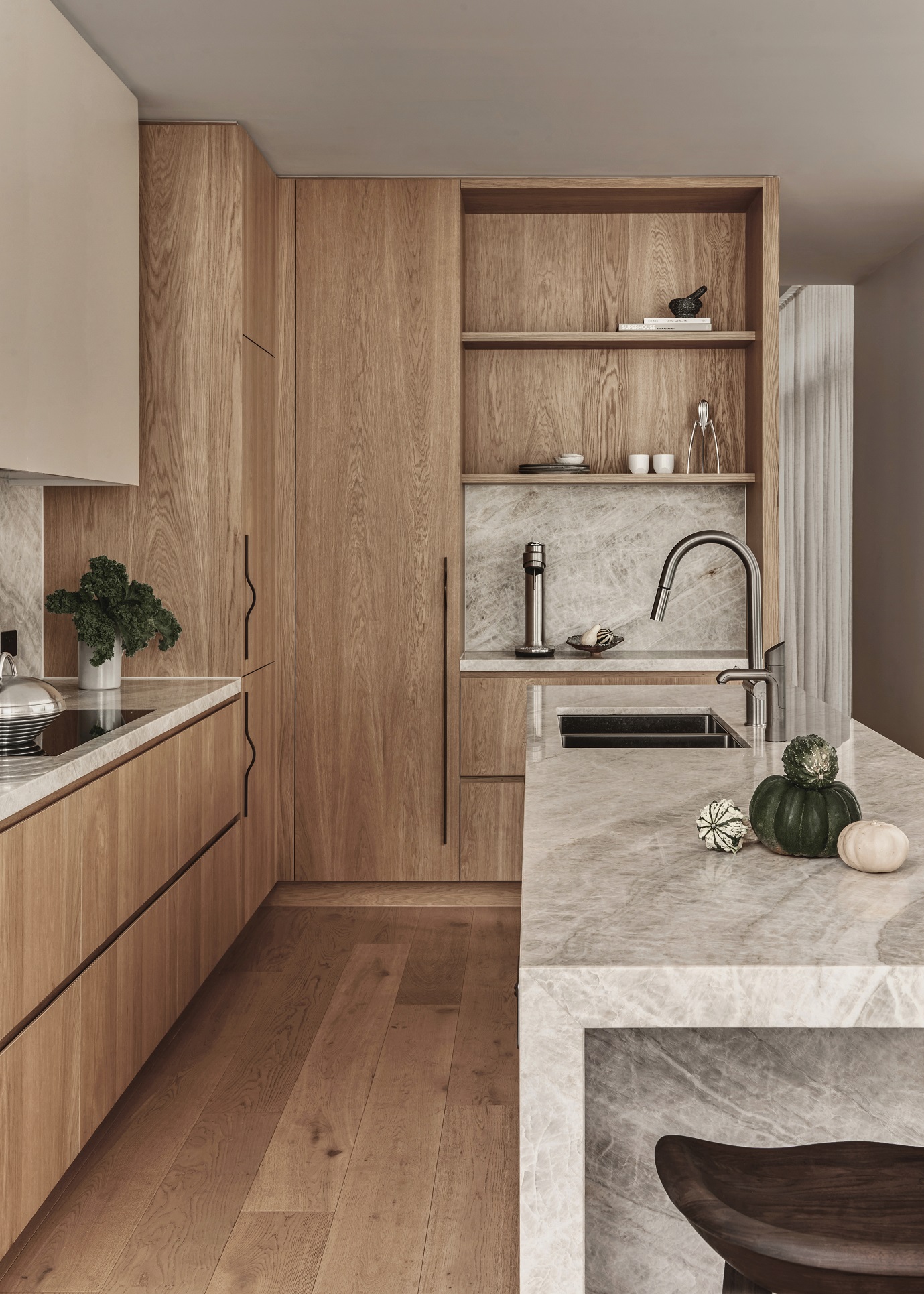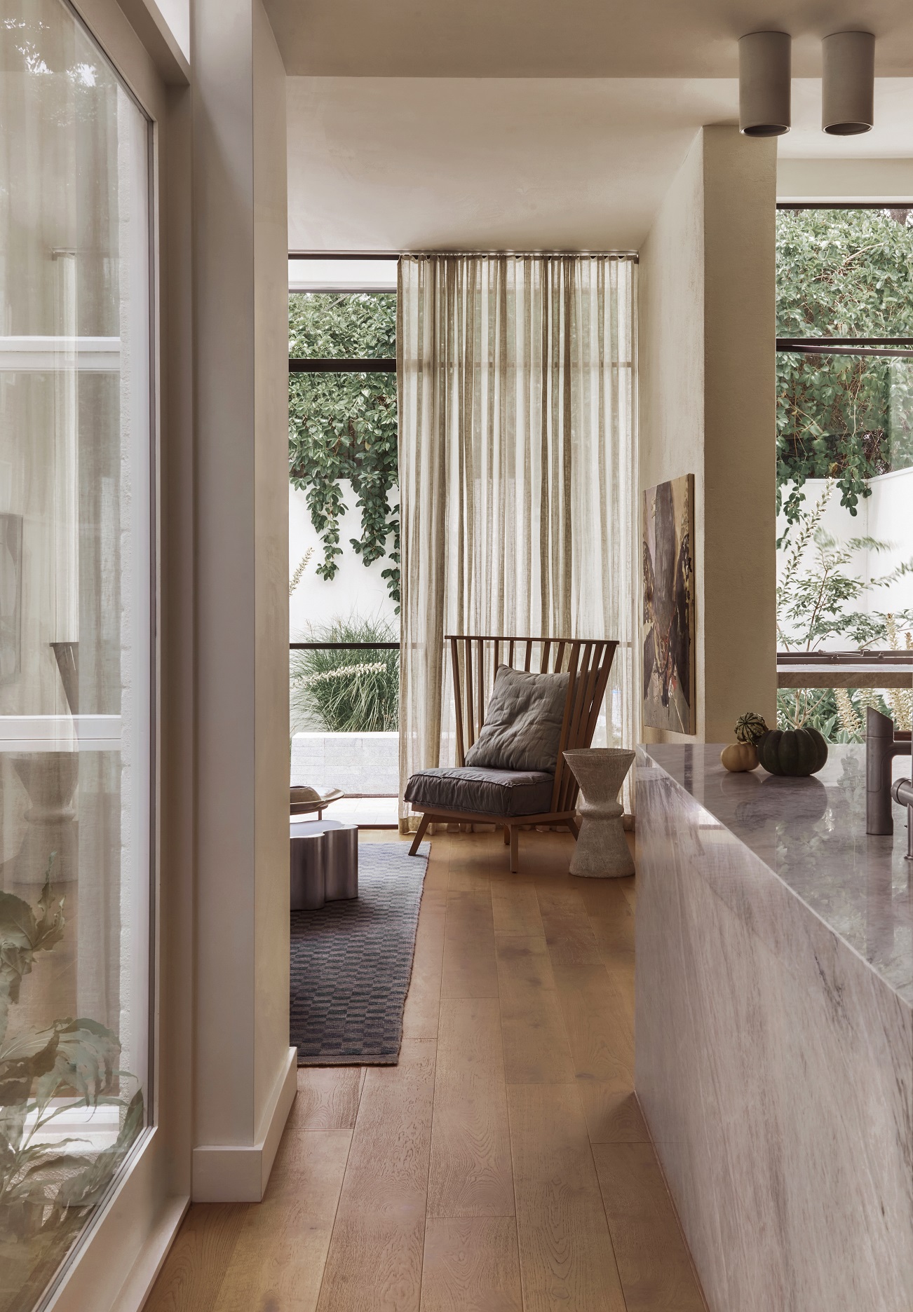 The renovation of this home by MEKR Studio mixes the heritage features with contemporary finishes. The material palette features a refined combination of warm timber, sculptural joinery and neutral hues.